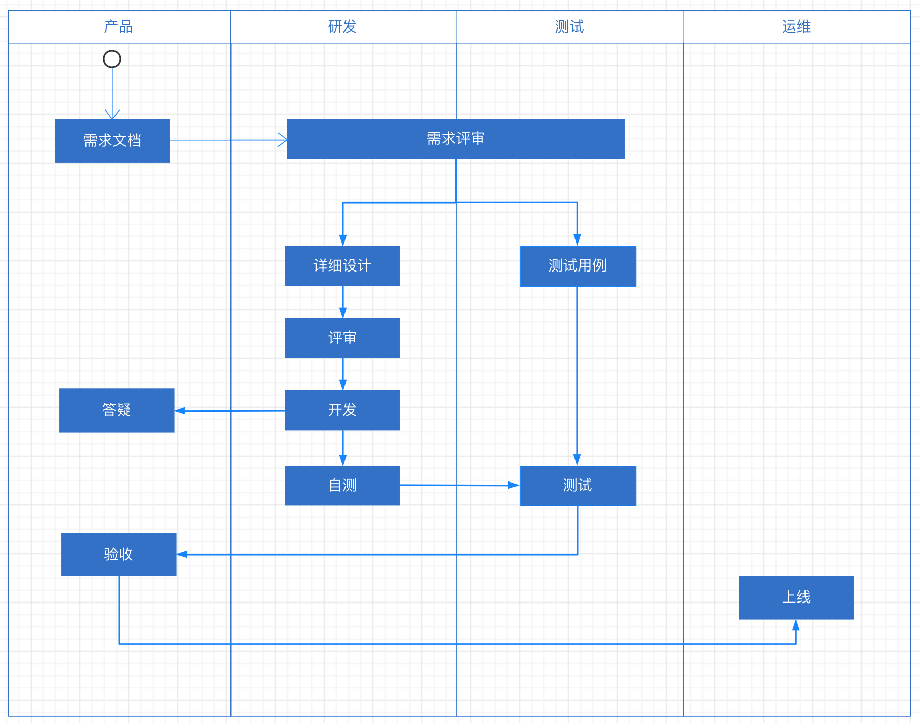 - 需求评审–》2. 详细设计–》3. 详设评审–》4. 开发 / 测试用例提交–》5. 提冒烟测试(提测验收)–》6. 功能测试–》7. bug修复–》8. 回归测试–》9. 产品验收