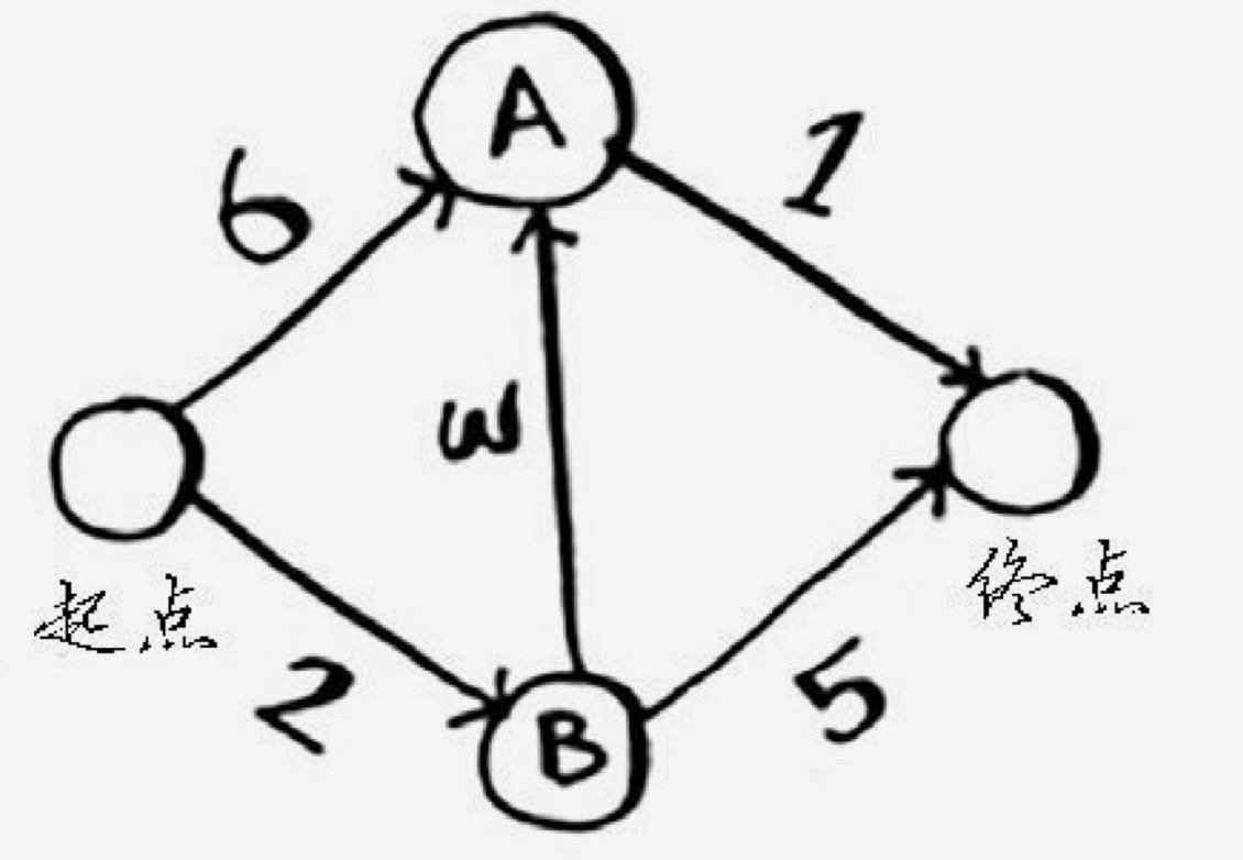 - 找到从起点到各相邻节点的成本。到A是 6,到B是2。到终点是我们要计算的值,目前是未知。